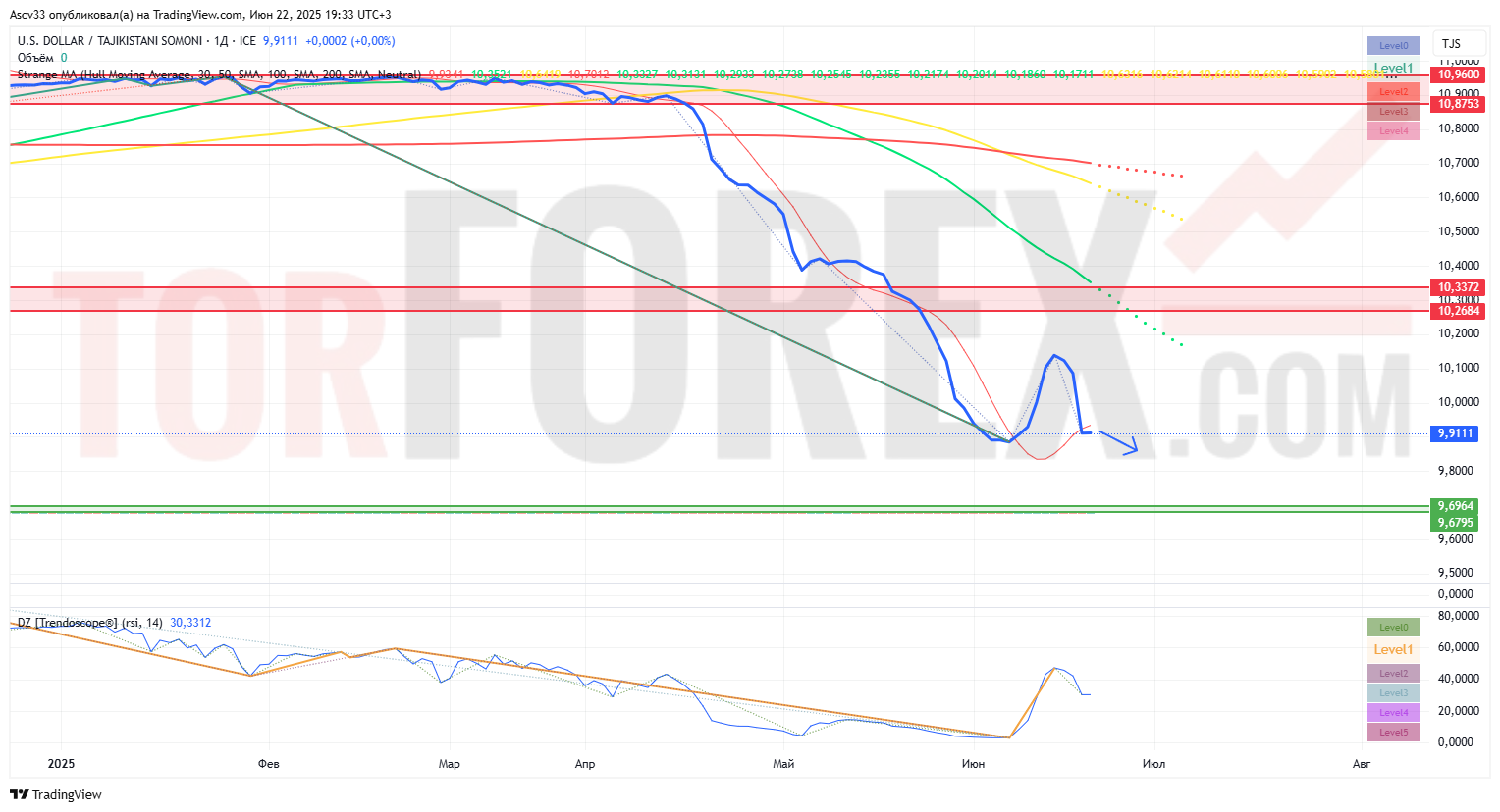 Пара USD/TJS торгуется на уровне 9,9111, находясь в нисходящем тренде с начала года. После краткой попытки коррекции выше 10,1 рынок вновь демонстрирует снижение. Общая техническая картина остаётся медвежьей.