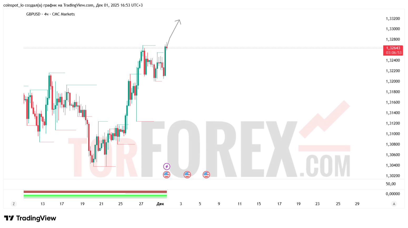 На 2 декабря 2025 года GBP/USD сохраняет нейтрально-восходящий импульс. Основной сценарий — движение к 1.3310–1.3340 USD при пробое 1.3280 USD. Альтернативный сценарий — коррекция к 1.3170–1.3140 USD при отказе от сопротивления.