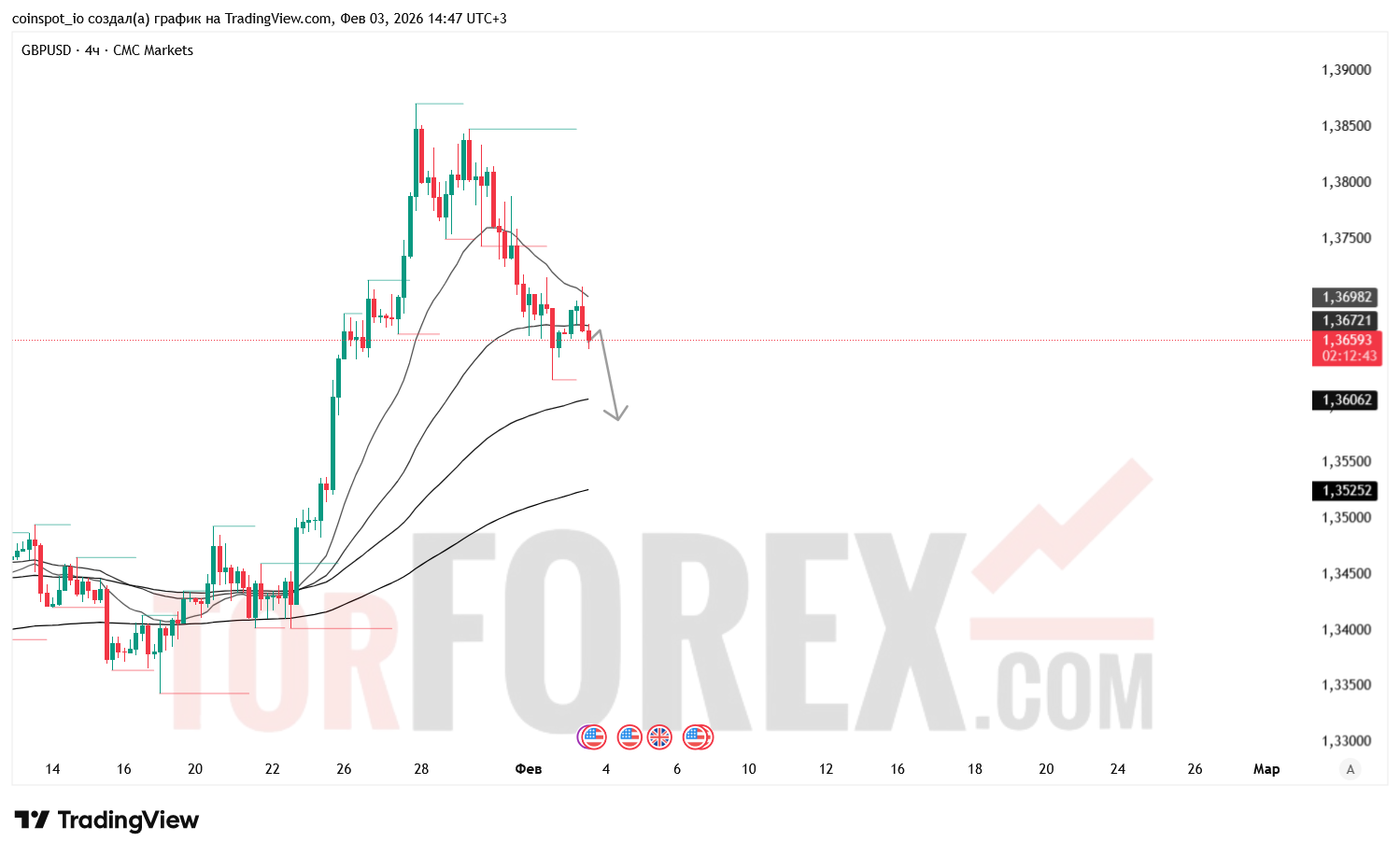 К началу торгового дня 4 февраля 2026 года пара GBP/USD остаётся под давлением продавцов. На 4‑часовом графике цена закрепилась в зоне 1.3660–1.3680, формируя узкую консолидацию после обновления локального минимума. Несмотря на попытки локального восстановления, структура рынка остаётся медвежьей: импульс продавцов сохраняется, а движение вверх выглядит исключительно коррекционным. Волатильность умеренная, но техническая картина указывает на вероятность продолжения снижения.