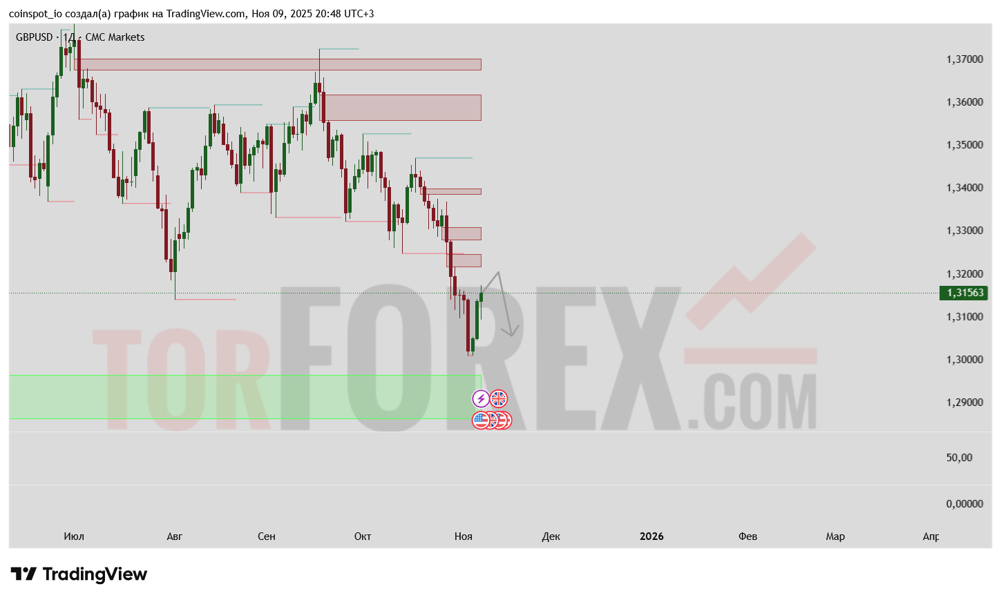 - Заполнение FVG-зоны усилит вероятность снижения к 1.3050–1.3020.