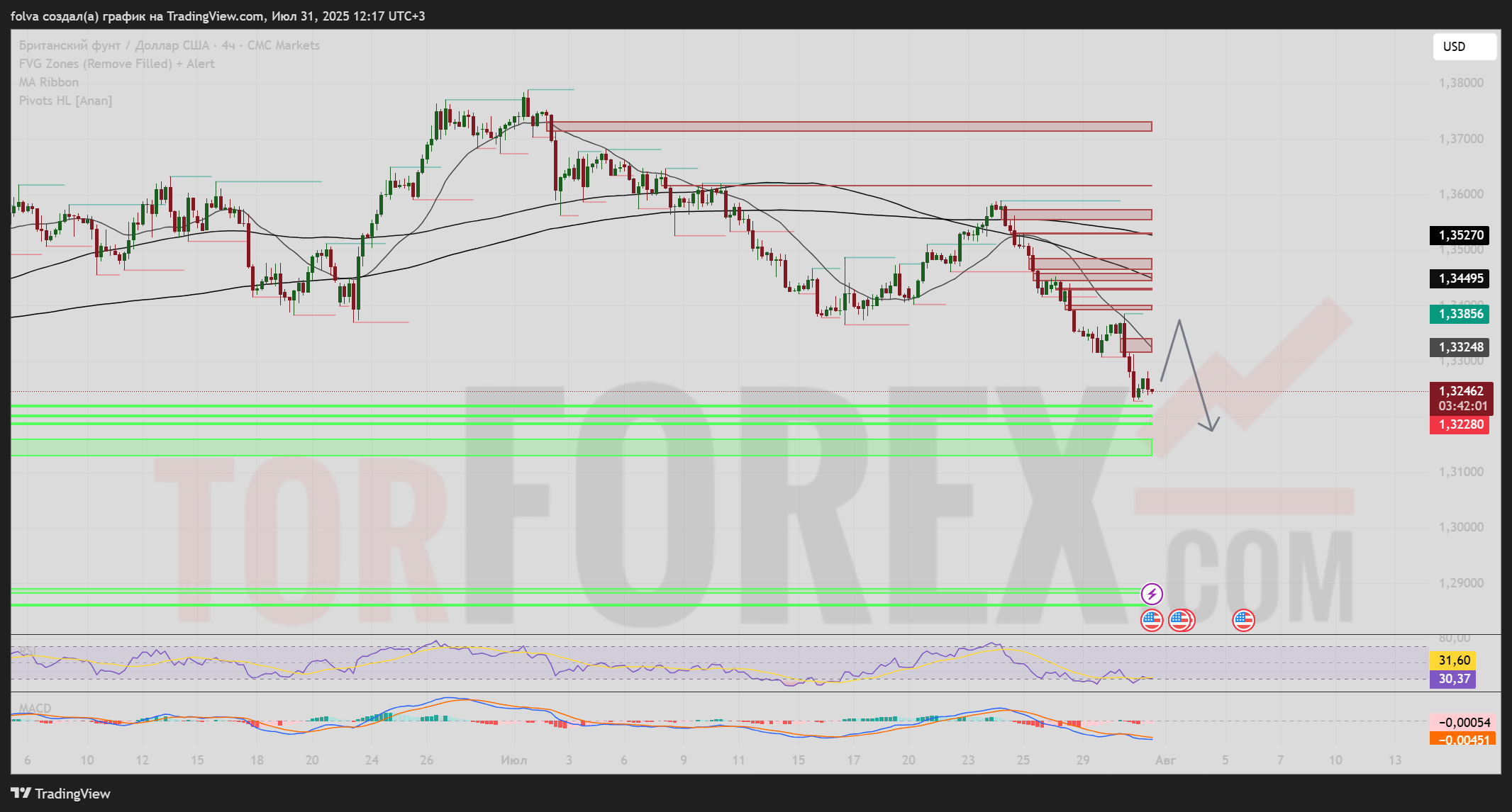 Общее техническое состояние пары GBP/USD остаётся медвежьим. Несмотря на локальные попытки коррекции, импульсные индикаторы и структура рынка продолжают указывать на преобладание продавцов. EMA-лента выступает сильным сопротивлением, а RSI и MACD не дают сигналов разворота.