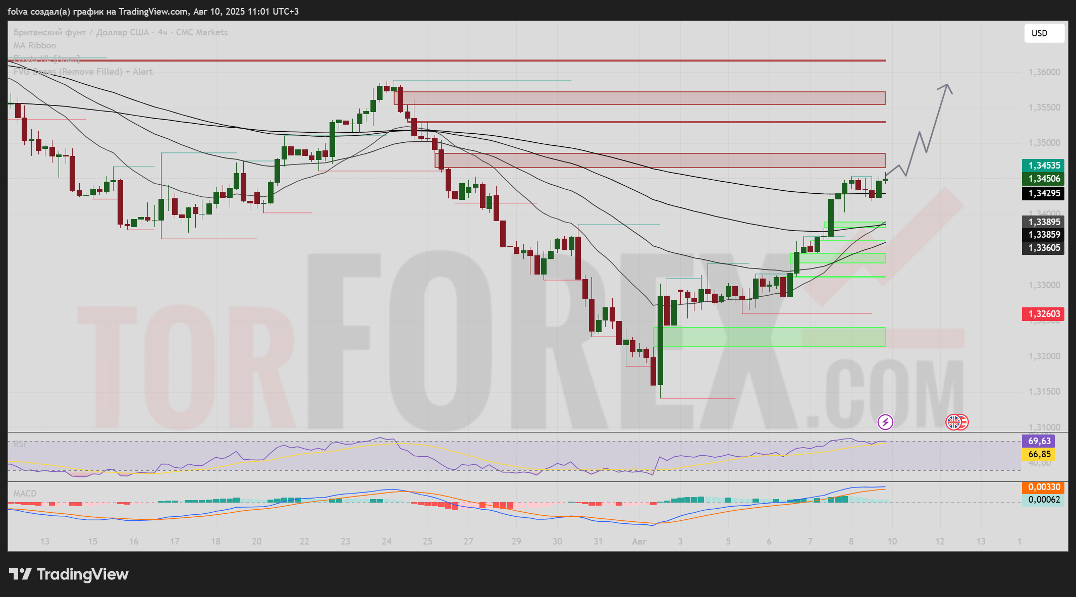 В начале августа торговая пара GBP/USD показала уверенный разворот вверх, преодолев важные уровни сопротивления и закрепившись выше ключевых EMA. Цена приближается к зоне сильного предложения, что делает текущую область критичной для определения дальнейшего направления движения. Анализ FVG-зон, EMA Ribbon, RSI и MACD помогает выделить приоритетные сценарии и важные уровни для предстоящей недели.