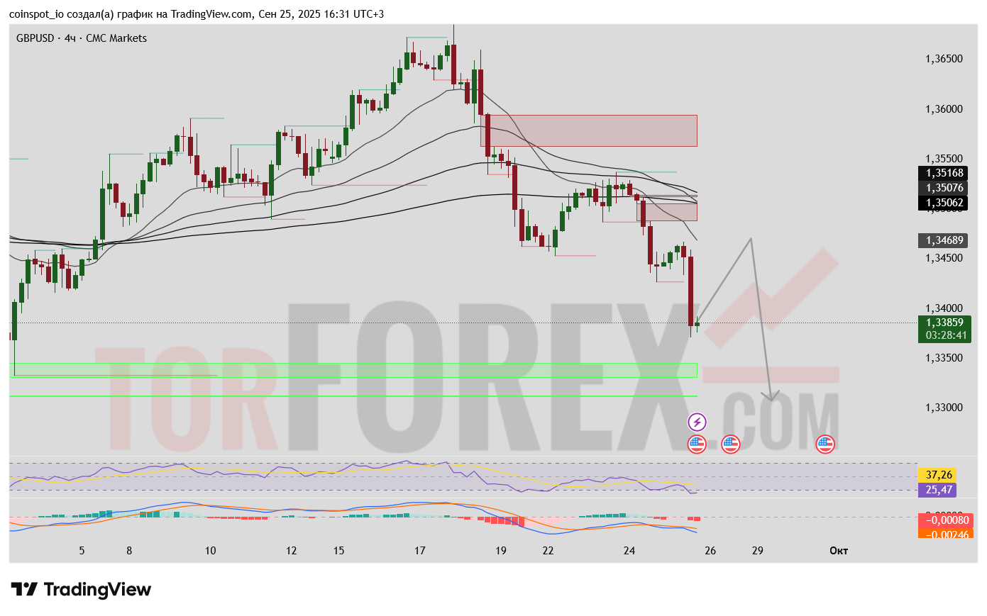 Приоритетный сценарий (Медвежий): Консолидация или незначительный технический отскок от текущих уровней с последующим продолжением движения к основной цели 1.33009. Любой откат к зоне 1.34624 — 1.34800 будет рассматриваться как оптимальная точка для добавления в короткие позиции, так как это ретест пробитого уровня.