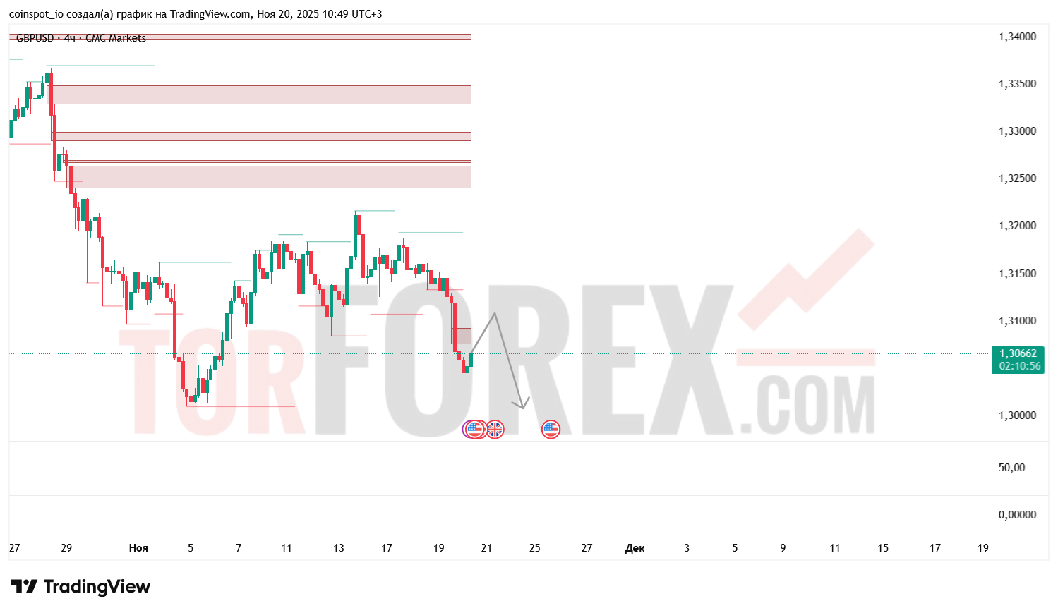 На 21 ноября 2025 года пара GBP/USD сохраняет медвежий импульс. Основной сценарий — движение к 1.3030 и 1.3000 USD. Торговая идея: открытие коротких позиций при ретесте зоны 1.3080–1.3100 USD, с стоп-лоссом выше 1.3120 USD. Альтернативный сценарий — лонг при закреплении выше 1.3100 USD, с целями 1.3150 USD, и стоп-лоссом ниже 1.3050 USD.