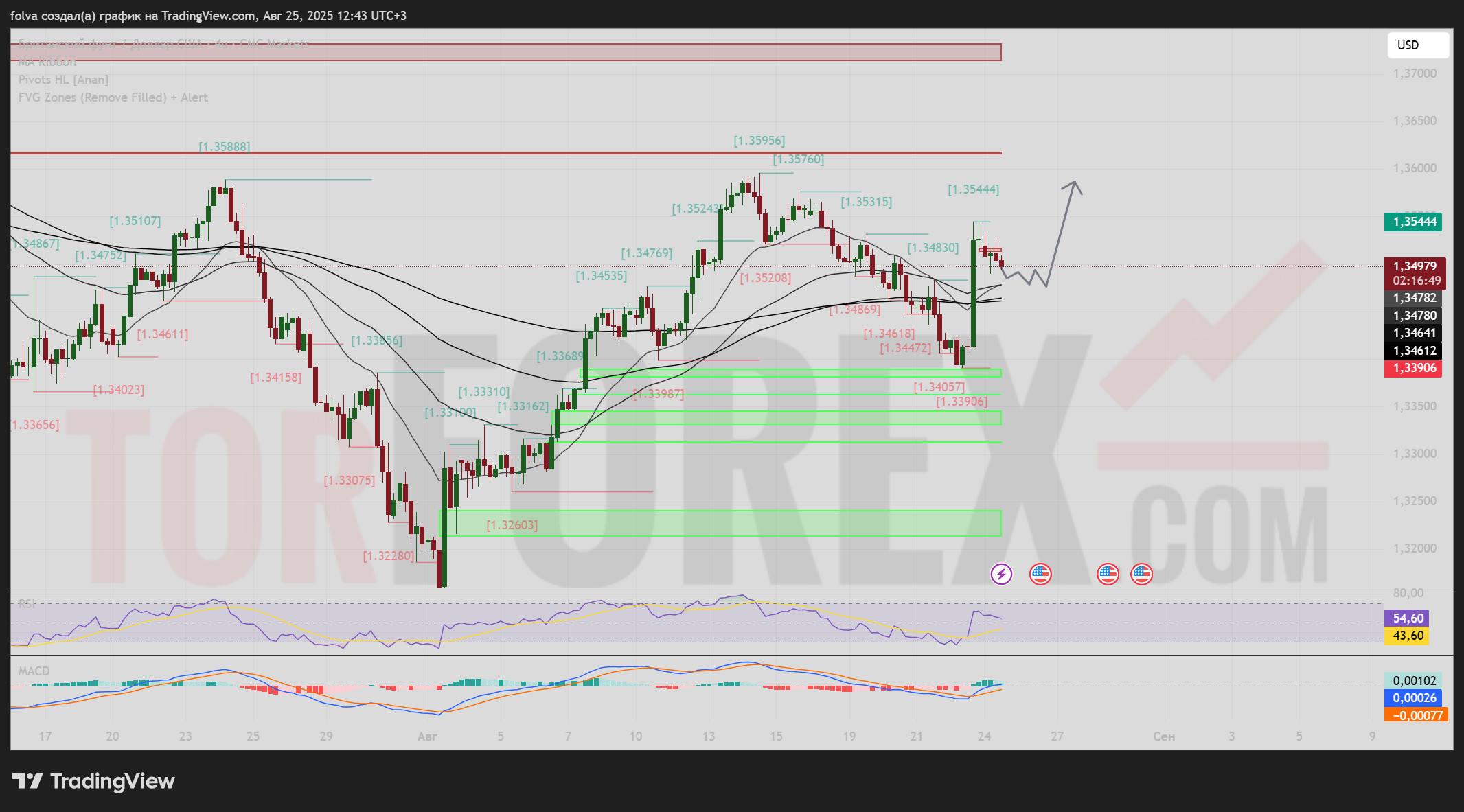 • Сопротивление: локальный максимум 1.3544, а выше — область 1.3575–1.3600, где ранее фиксировались продавцы.