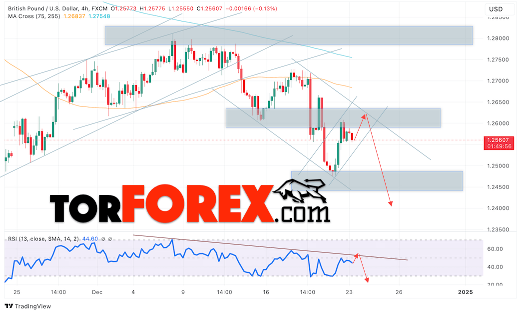 Таким образом, GBP/USD прогноз Британского Фунта на 24 декабря 2024 предполагает попытку развития роста и теста области сопротивления вблизи уровня 1.2615. Затем, продолжение падения с целью вблизи уровня 1.2405. Дополнительным сигналом в пользу снижения Британского Фунта выступит тест линии сопротивления на индикаторе относительной силы (RSI). Отменой варианта роста станет сильный рост Британского Фунта против Доллара США и пробой области 1.2665. Это укажет на продолжение подъёма на Форекс пары с потенциальной целью выше уровня 1.2785.