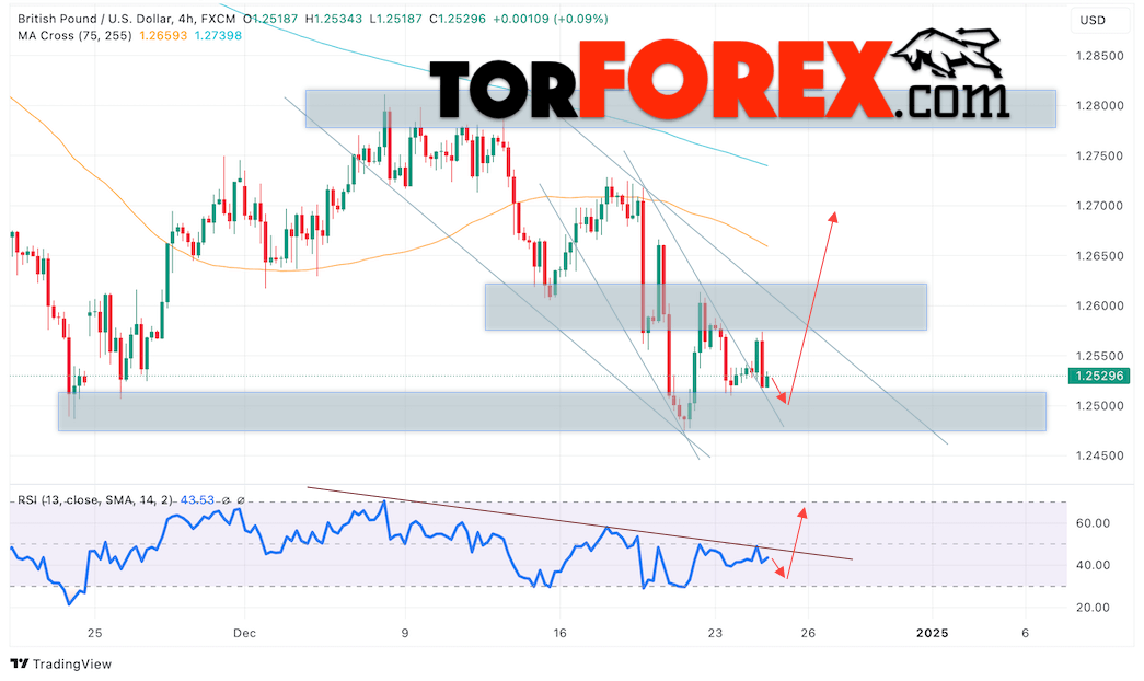 Таким образом, GBP/USD прогноз Британского Фунта на 26 декабря 2024 предполагает попытку развития падения и теста области поддержки вблизи уровня 1.2505. Затем, продолжение подъёма котировок с целью вблизи уровня 1.2715. Дополнительным сигналом в пользу роста Британского Фунта выступит тест линии поддержки на индикаторе относительной силы (RSI). Отменой варианта подъёма станет падение Британского Фунта против Доллара США и пробой области 1.2425. Это укажет на продолжение падения на Форекс пары с потенциальной целью ниже уровня 1.2215.