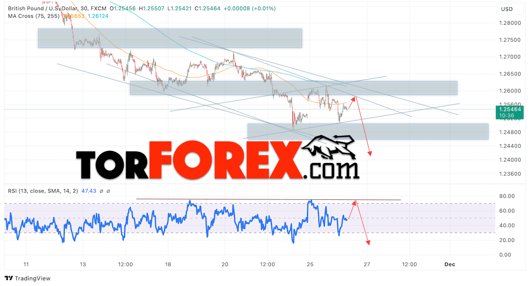 Таким образом, GBP/USD прогноз Британского Фунта на 27 ноября 2024 предполагает попытку теста области сопротивления вблизи уровня 1.2575. Затем, продолжение падения с целью вблизи уровня 1.2415. Дополнительным сигналом в пользу снижения Британского Фунта выступит тест линии сопротивления на индикаторе относительной силы (RSI). Отменой варианта падения станет сильный рост Британского Фунта против Доллара США и пробой области 1.2655. Это укажет на продолжение подъёма на Форекс пары с потенциальной целью выше уровня 1.2765.