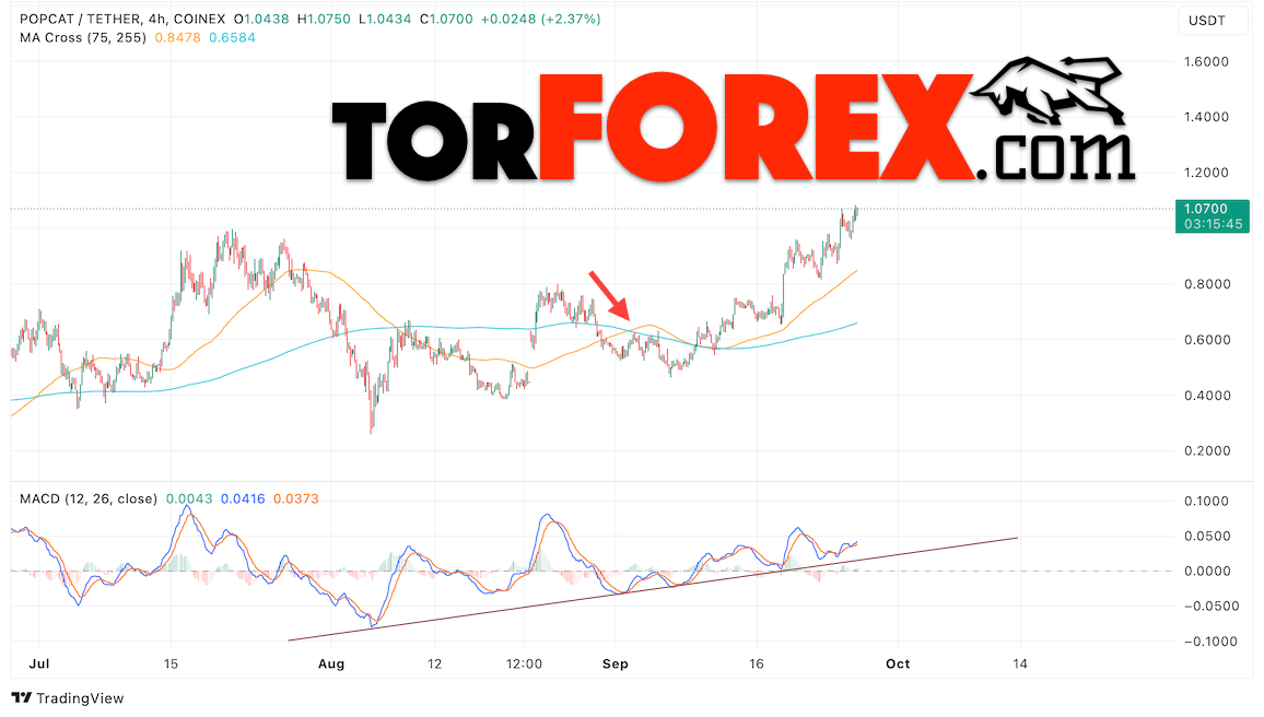 Цена торгуется над линией EMA 75, что предполагает наличие восходящего тренда. Продавцы несколько раз пытались закрепиться под линией, но эти попытки были неудачным и цены двигались дальше вверх. Можно сказать, что падение цен под линию EMA 75 указывает на сильный сигнал для покупок монеты, в popcat криптовалюта цена прогноз в этом случае предполагает обновление локального максимума. На Н4-таймфрейме мувинги 75 и 255 пересеклись в пользу бычьего тренда., что подтверждает идею с дневного графика криптовалюты.