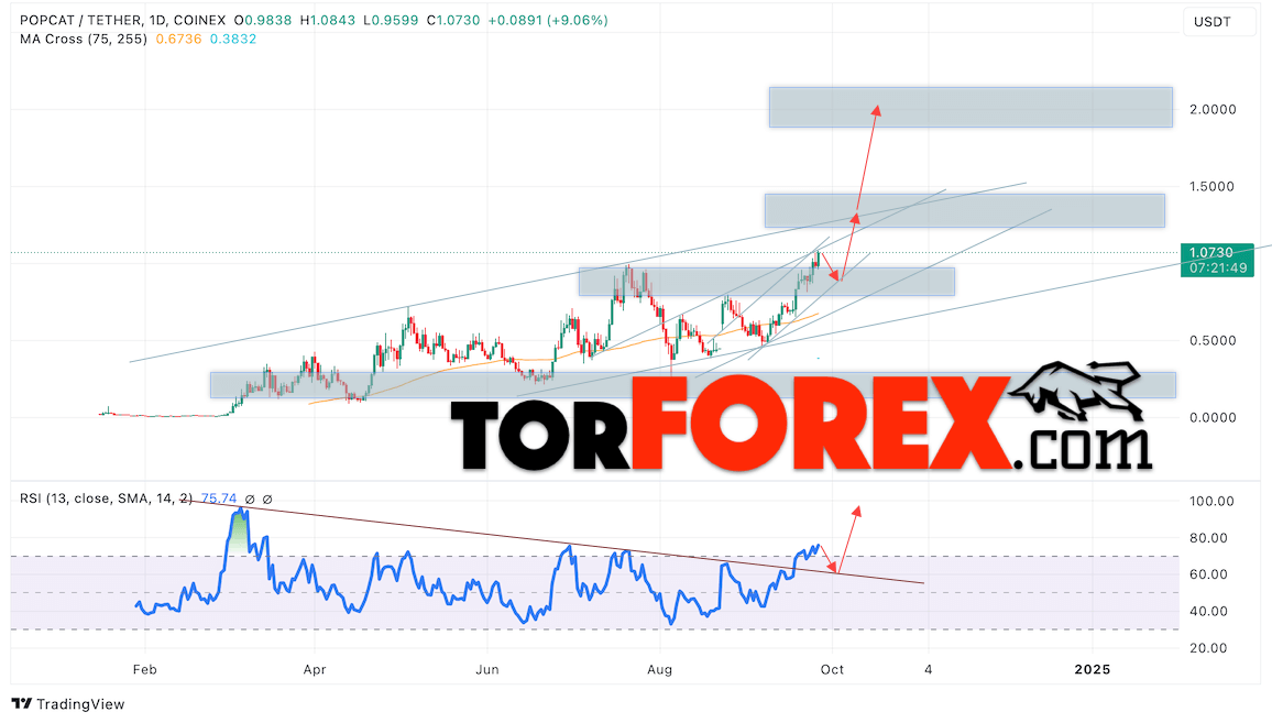 С точки зрения технического анализа Popcat котировки монеты агрессивно растут в рамках бычьего канала. Сохраняется потенциал для развития коррекции перед тестом верхней границы канала на уровне 1.4000. Сильным сигналом в пользу роста на ширину канала, станет пробой уровня 1.5000, в этом случае целью роста выступит отметка 2.0000 и выше. Негативным вариантом для быков может стать падение котировок под уровень 0.6500.