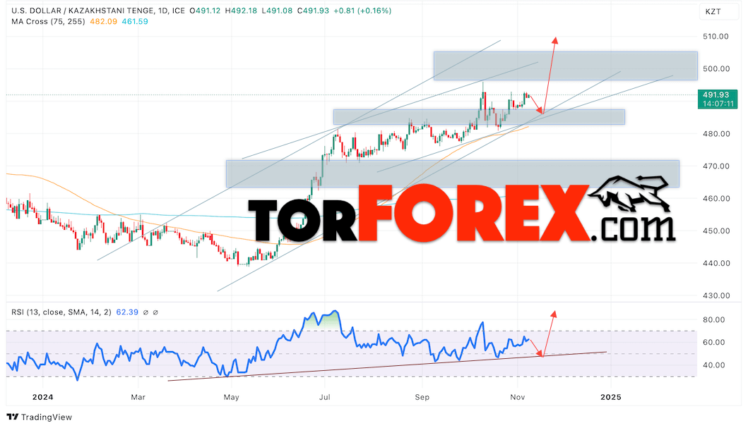 Дополнительным сигналом в пользу подъёма валютной пары USD/KZT 11 — 15 ноябрь 2024 выступит отбой от восходящей линии тренда на индикаторе относительной силы (RSI). Вторым сигналом станет отток от нижней границы восходящего канала. Отменой варианта роста пары USD/KZT на выступит снижение котировок и пробой уровня 481.05 Тенге за Доллар. Это укажет на пробой области нижней границы восходящего канала и продолжение падения пары Доллар Казахский Тенге к отметке 477.85. Подтверждением росту пары выступит пробой области сопротивления и закрытие котировок актива над уровнем 493.85.