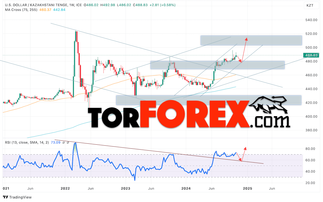 Валютная пара Доллар США Казахский Тенге USDKZT торгуется в начале месяца в рамках подъёма и восходящего канала. В момент публикации прогноза курс Доллара США к Китайскому Юаню составляет 488.83. Скользящие средние указывают на наличие краткосрочной бычьей тенденции. Цены пробили область между сигнальными линиями вверх, что указывает на давление со стороны покупателей американской валюты и потенциальное продолжение роста Доллара США против Казахского Тенге. В рамках прогноза курса Доллара на ноябрь 2024 стоит ожидать попытку развития снижения цены и тест уровня поддержки вблизи области 481.05 Казахский Тенге за Доллар США. Затем, отскок вверх и продолжение роста валютной пары в область выше уровня 505.05.