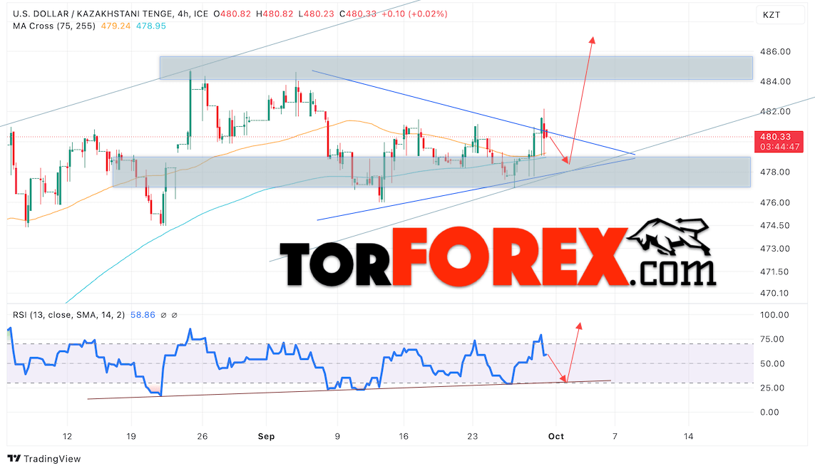Дополнительным сигналом в пользу роста валютной пары USD/KZT 1 октября 2024 выступит отбой от бычьей линии тренда на индикаторе относительной силы (RSI). Вторым сигналом станет отток от нижней границы восходящего канала. Отменой варианта подъёма пары USD/KZT выступит падение котировок и пробой уровня 476.05 Тенге за Доллар. Это укажет на пробой области поддержки и продолжение падения пары Доллар Казахский Тенге в область ниже уровня 472.55. Подтверждением росту пары выступит пробой области сопротивления и закрытие котировок актива над уровнем 483.05, что укажет на пробой верхней границы модели «Треугольник» и начало отработки паттерна с целями вверху.