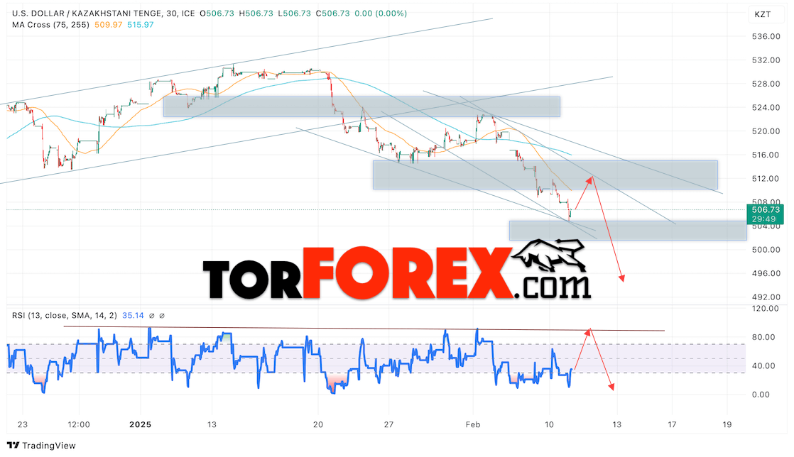 Дополнительным сигналом в пользу падения валютной пары USD/KZT 12 февраля 2025 выступит отбой от линии тренда на индикаторе относительной силы (RSI). Вторым сигналом станет отскок от верхней границы медвежьего канала. Отменой варианта падения валютной пары USD/KZT выступит сильный рост котировок и пробой уровня 520.75 Тенге за Доллар. Это укажет на пробой области сопротивления и продолжение роста пары Доллар Казахский Тенге в область выше уровня 530.05. Подтверждением падению пары выступит пробой области поддержки и закрытие котировок актива под уровнем 502.05.