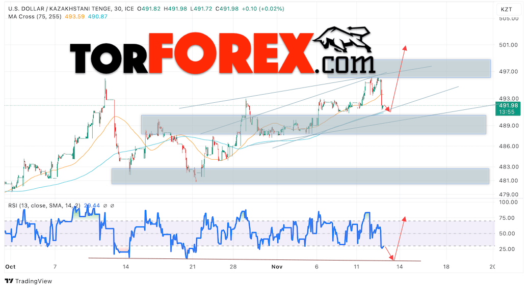 Дополнительным сигналом в пользу подъёма валютной пары USD/KZT 14 ноября 2024 выступит отбой от линии поддержки на индикаторе относительной силы (RSI). Вторым сигналом станет отток от нижней границы бычьего канала. Отменой варианта подъёма пары USD/KZT выступит падение котировок и пробой уровня 488.05 Тенге за Доллар. Это укажет на пробой области поддержки и продолжение падения пары Доллар Казахский Тенге в область ниже уровня 486.05. Подтверждением росту пары выступит пробой области сопротивления и закрытие котировок актива над уровнем 497.85.