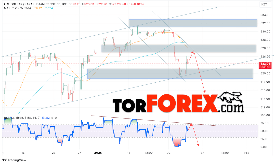Дополнительным сигналом в пользу падения валютной пары USD/KZT 24 января 2025 выступит отбой от нисходящей линии тренда на индикаторе относительной силы (RSI). Вторым сигналом станет отскок от верхней границы нисходящего канала. Отменой варианта снижения валютной пары USD/KZT выступит сильный рост котировок и пробой уровня 527.05 Тенге за Доллар. Это укажет на пробой области сопротивления и продолжение подъёма пары Доллар Казахский Тенге в область выше уровня 545.05. Подтверждением падению пары выступит пробой области поддержки и закрытие котировок актива под уровнем 518.05, что укажет на пробой нижней границы бычьего канала.