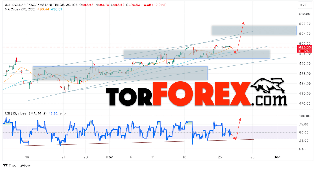 Дополнительным сигналом в пользу подъёма валютной пары USD/KZT 27 ноября 2024 выступит отбой от линии поддержки на индикаторе относительной силы (RSI). Вторым сигналом станет отток от нижней границы бычьего канала. Отменой варианта подъёма пары USD/KZT выступит падение котировок и пробой уровня 493.65 Тенге за Доллар. Это укажет на пробой области поддержки и продолжение падения пары Доллар Казахский Тенге в область ниже уровня 490.25. Подтверждением росту пары выступит пробой области сопротивления и закрытие котировок актива над уровнем 501.75.
