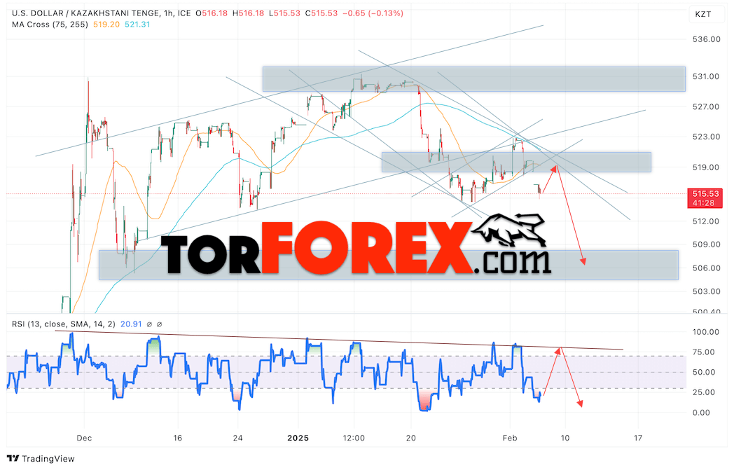 Дополнительным сигналом в пользу падения валютной пары USD/KZT 7 февраля 2025 выступит отбой от линии тренда на индикаторе относительной силы (RSI). Вторым сигналом станет отскок от верхней границы медвежьего канала. Отменой варианта падения валютной пары USD/KZT выступит сильный рост котировок и пробой уровня 524.05 Тенге за Доллар. Это укажет на пробой области сопротивления и продолжение роста пары Доллар Казахский Тенге в область выше уровня 535.05. Подтверждением падению пары выступит пробой области поддержки и закрытие котировок актива под уровнем 512.05.
