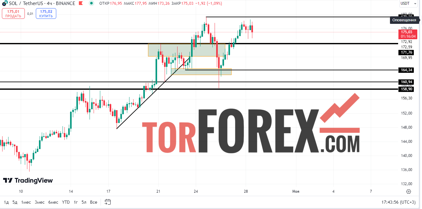 На сегодня SOL показывает признаки восходящего тренда после недавнего роста. Цена недавно поднялась выше ключевых уровней поддержки и сопротивления, а также важнейших средних значений.