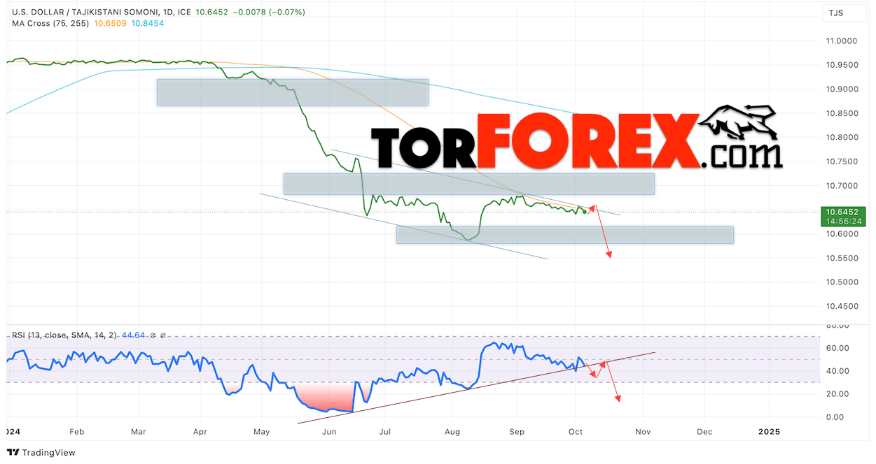 Дополнительным сигналом в пользу снижения валютной пары USD/TJS 7 — 11 октября 2024 выступит тест линии сопротивления на индикаторе относительной силы (RSI). Вторым сигналом станет пробой от верхней границы медвежьего канала. Отменой варианта снижения пары USD/TJS станет сильный рост котировок и пробой уровня 10.6700 Сомони за Доллар. Это укажет на пробой области сопротивления и продолжение роста пары Доллар Таджикский Сомони в область выше уровня 11.6500. Подтверждением падению пары выступит пробой области поддержки и закрытие котировок актива над уровнем 10.6205.