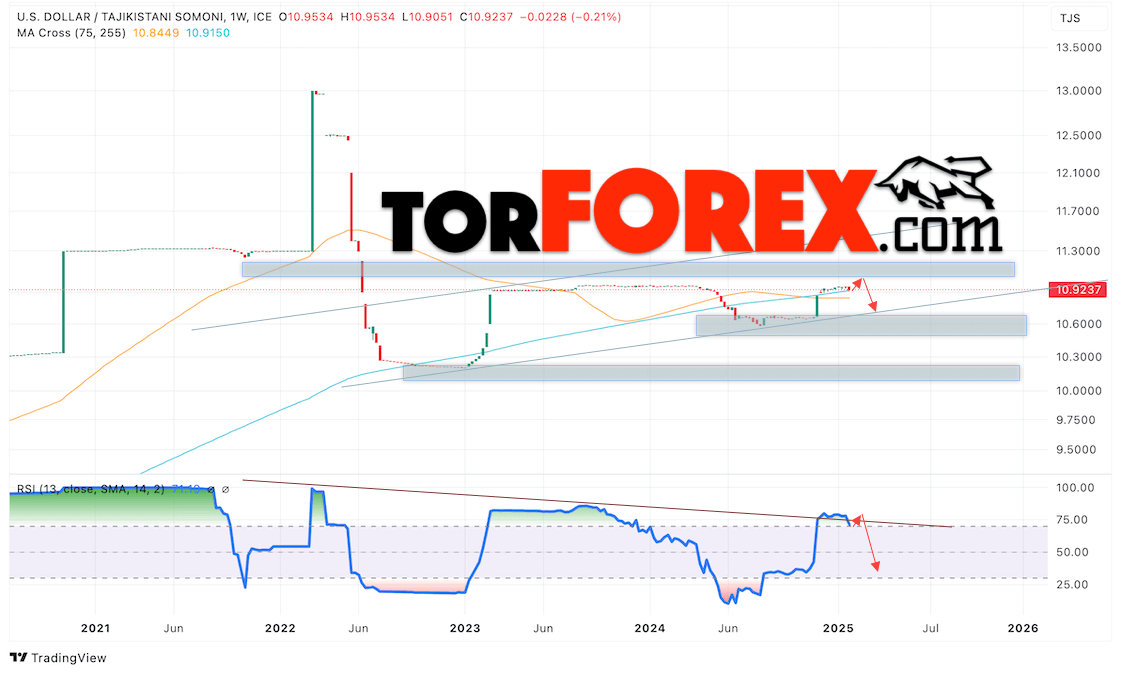 Дополнительным сигналом в пользу снижения валютной пары USD/TJS в феврале 2025 выступит тест медвежьей линии тренда на индикаторе относительной силы (RSI). Вторым сигналом станет отбой от области сопротивления на графике цены. Отменой варианта падения пары USD/TJS станет сильный рост котировок и пробой уровня 10.9785 Сомони за Доллар. Это укажет на пробой ключевого сопротивления и продолжение роста пары Доллар Таджикский Сомони в область выше уровня 11.0505. Подтверждением падению пары выступит пробой области поддержки и закрытие котировок валютной пары под уровнем 10.8905.