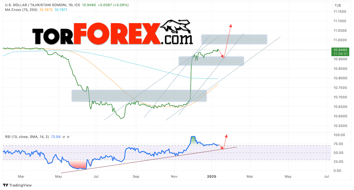 Дополнительным сигналом в пользу подъёма валютной пары USD/TJS 13 — 17 января 2025 выступит тест бычьей линии тренда на индикаторе относительной силы (RSI). Вторым сигналом станет отбой от нижней границы бычьего канала. Отменой варианта роста пары USD/TJS станет падение котировок и пробой уровня 10.8365 Сомони за Доллар. Это укажет на пробой области поддержки и продолжение падения пары Доллар Таджикский Сомони в область ниже уровня 10.7605. Подтверждением росту пары выступит пробой области сопротивления и закрытие котировок актива над уровнем 10.9775.
