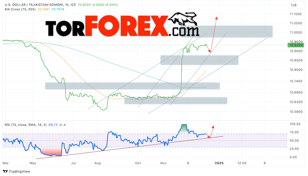 Валютная пара Доллар США Таджикский Сомони USDTJS продолжает движение в рамках роста и бычьего канала. В момент публикации прогноза курс Доллара США к Таджикскому Сомони составляет 10.9320. Скользящие средние указывают на наличие краткосрочной восходящей тенденции. Цены пробили область между сигнальными линиями вверх, что указывает на давление со стороны покупателей американской валюты и потенциальное продолжение подъёма курса Доллара США против Таджикского Сомони. В рамках прогноза курса Доллара на 1 января 2025 стоит ожидать попытку развития медвежьей коррекции цены и тест уровня поддержки вблизи области 10.8865 Сомони за Доллар США. Затем, отскок вверх и продолжение роста валютной пары в область выше уровня 11.0665.