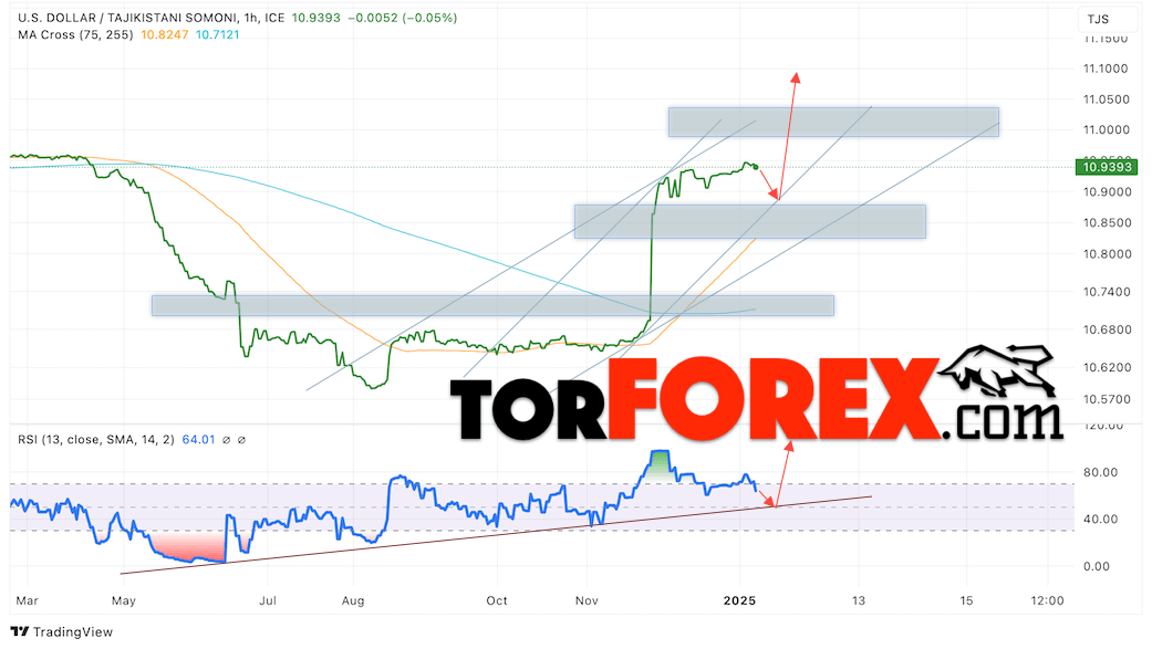 Валютная пара Доллар США Таджикский Сомони USDTJS продолжает движение в рамках незначительного падения и бычьего канала. В момент публикации прогноза курс Доллара США к Таджикскому Сомони составляет 10.9393. Скользящие средние указывают на наличие краткосрочной бычьей тенденции. Цены остаются над сигнальными линиями, что указывает на давление со стороны покупателей американской валюты и потенциальное продолжение подъёма курса Доллара США против Таджикского Сомони. В рамках прогноза курса Доллара на 10 января 2025 стоит ожидать попытку развития незначительной коррекции и тест уровня поддержки вблизи области 10.9005 Сомони за Доллар США. Затем, отскок вверх и продолжение роста валютной пары в область выше уровня 11.1005.
