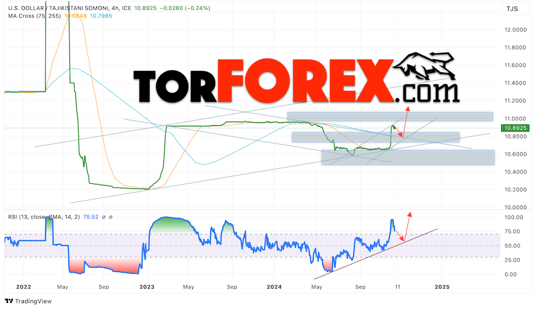 Дополнительным сигналом в пользу роста валютной пары USD/TJS 11 декабря 2024 выступит отбой от восходящей линии тренда на индикаторе относительной силы (RSI). Вторым сигналом станет отбой от верхней границы нисходящего канала. Отменой варианта роста пары USD/TJS станет падение котировок и пробой уровня 10.7905 Сомони за Доллар. Это укажет на пробой области поддержки и продолжение падения пары Доллар Таджикский Сомони в область ниже уровня 10.7065. Подтверждением росту пары выступит пробой области сопротивления и закрытие котировок актива над уровнем 10.9365.