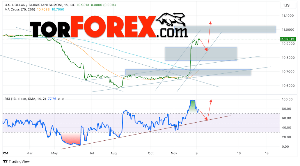 Дополнительным сигналом в пользу роста валютной пары USD/TJS 12 декабря 2024 выступит отбой от восходящей линии тренда на индикаторе относительной силы (RSI). Вторым сигналом станет отбой от нижней границы бычьего канала. Отменой варианта роста пары USD/TJS станет падение котировок и пробой уровня 10.7985 Сомони за Доллар. Это укажет на пробой области поддержки и продолжение падения пары Доллар Таджикский Сомони в область ниже уровня 10.7105. Подтверждением росту пары выступит пробой области сопротивления и закрытие котировок актива над уровнем 10.9555.
