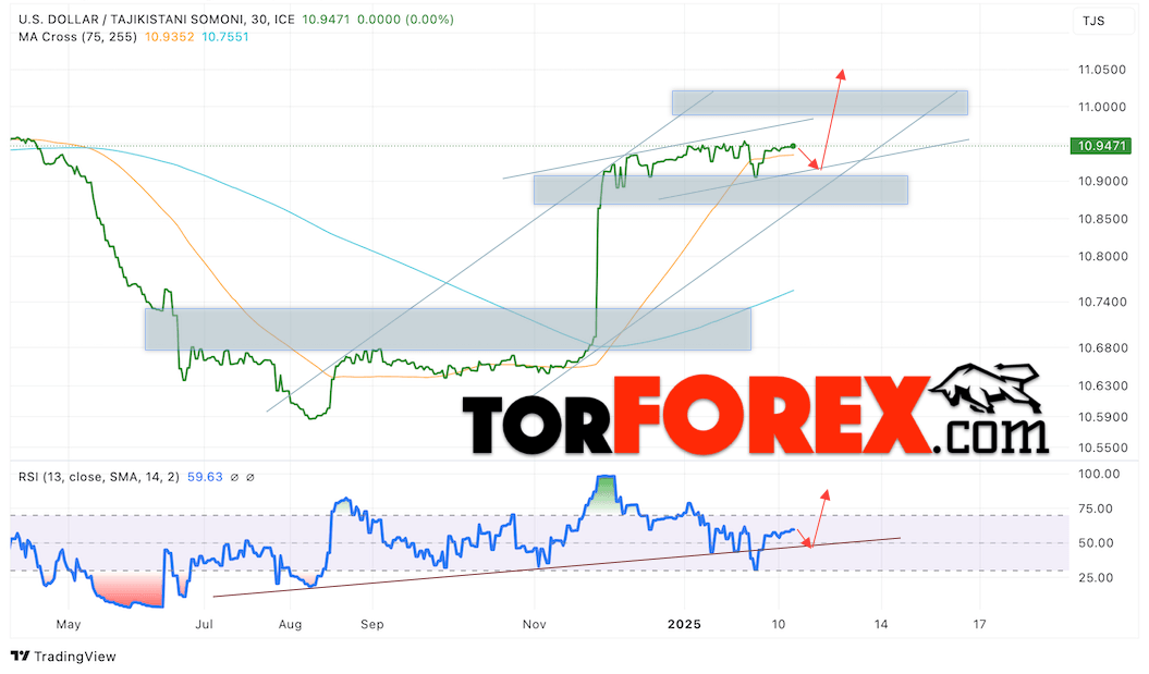 Валютная пара Доллар США Таджикский Сомони USDTJS продолжает движение в рамках незначительного подъёма и тестирует ключевое сопротивление. В момент публикации прогноза курс Доллара США к Таджикскому Сомони составляет 10.9471. Скользящие средние указывают на наличие краткосрочной бычьей тенденции. Цены пробили область сигнальных линий вверх, что указывает на давление со стороны покупателей американской валюты и потенциальное продолжение роста курса Доллара США против Таджикского Сомони. В рамках прогноза курса Доллара на 14 февраля 2025 стоит ожидать попытку развития падения и тест уровня поддержки вблизи области 10.9245 Сомони за Доллар США. Затем, отбой цены вверх и продолжение роста валютной пары в область выше уровня 11.0505.
