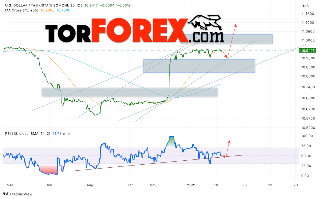 Дополнительным сигналом в пользу роста валютной пары USD/TJS 18 февраля 2025 выступит отбой от бычьей линии тренда на индикаторе относительной силы (RSI). Вторым сигналом станет отбой от нижней границы бычьего канала. Отменой варианта роста пары USD/TJS станет падение котировок и пробой уровня 10.8775 Сомони за Доллар. Это укажет на пробой области поддержки и продолжение падения пары Доллар Таджикский Сомони в область ниже уровня 10.7905. Подтверждением росту пары выступит пробой области сопротивления и закрытие котировок актива над уровнем 11.0065.
