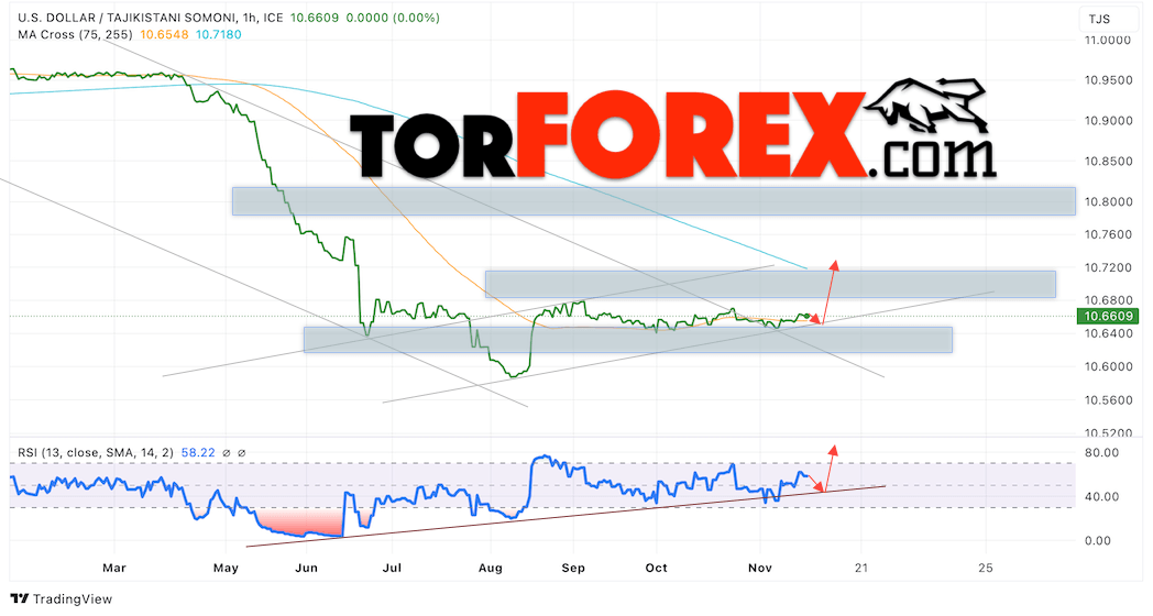 Валютная пара Доллар США Таджикский Сомони USDTJS продолжает движение в рамках развития коррекции и бычьего канала. В момент публикации прогноза курс Доллара США к Таджикскому Сомони составляет 10.6609. Скользящие средние указывают на наличие краткосрочной медвежьей тенденции. Цены тестируют область между сигнальными линиями, что указывает на давление со стороны продавцов американской валюты и потенциальное продолжение падения Доллара США против Таджикского Сомони. В рамках прогноза курса Доллара на 21 ноября 2024 стоит ожидать попытку развития медвежьей коррекции цены и тест уровня поддержки вблизи области 10.6545 Сомони за Доллар США. Затем, отскок вверх и продолжение роста валютной пары в область выше уровня 10.7215.
