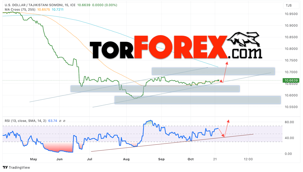 Дополнительным сигналом в пользу роста валютной пары USD/TJS 24 октября 2024 выступит пробой бычьей линии тренда на индикаторе относительной силы (RSI). Вторым сигналом станет отбой от нижней границы бычьего канала. Отменой варианта роста пары USD/TJS станет падение котировок и пробой уровня 10.6305 Сомони за Доллар. Это укажет на пробой области поддержки и продолжение падения пары Доллар Таджикский Сомони в область ниже уровня 10.6055. Подтверждением росту пары выступит пробой области сопротивления и закрытие котировок актива над уровнем 10.6775.