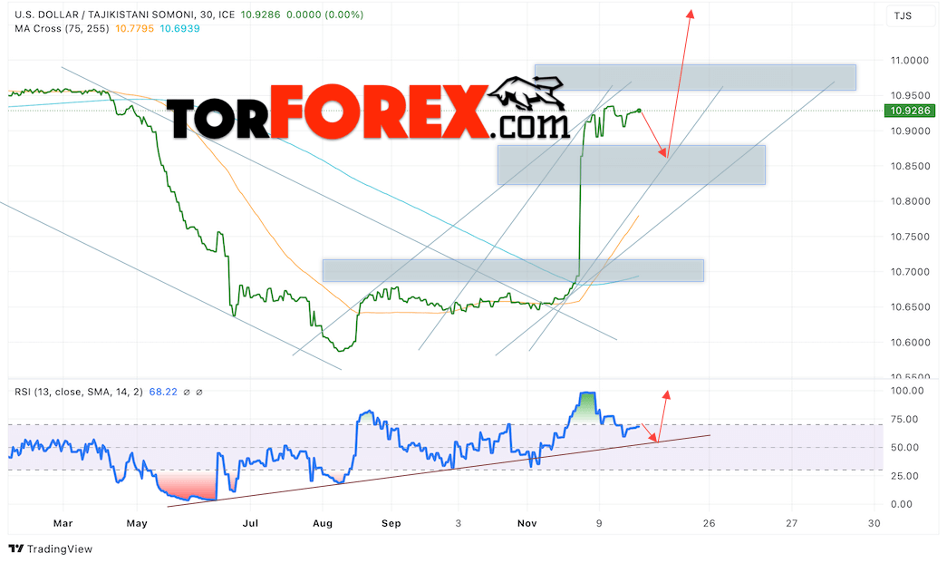 Дополнительным сигналом в пользу роста валютной пары USD/TJS 26 декабря 2024 выступит отбой от восходящей линии тренда на индикаторе относительной силы (RSI). Вторым сигналом станет отбой от нижней границы бычьего канала. Отменой варианта роста пары USD/TJS станет падение котировок и пробой уровня 10.8025 Сомони за Доллар. Это укажет на пробой области поддержки и продолжение падения пары Доллар Таджикский Сомони в область ниже уровня 10.7645. Подтверждением росту пары выступит пробой области сопротивления и закрытие котировок актива над уровнем 10.9705.