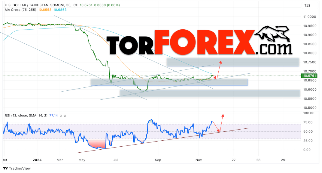 Валютная пара Доллар США Таджикский Сомони USDTJS продолжает движение в рамках роста и восходящего канала. В момент публикации прогноза курс Доллара США к Таджикскому Сомони составляет 10.6761. Скользящие средние указывают на наличие краткосрочной медвежьей тенденции. Цены тестируют область между сигнальными линиями, что указывает на давление со стороны продавцов американской валюты и потенциальное продолжение падения Доллара США против Таджикского Сомони. В рамках прогноза курса Доллара на 27 ноября 2024 стоит ожидать попытку развития медвежьей коррекции цены и тест уровня поддержки вблизи области 10.6515 Сомони за Доллар США. Затем, отскок вверх и продолжение роста валютной пары в область выше уровня 10.7495.