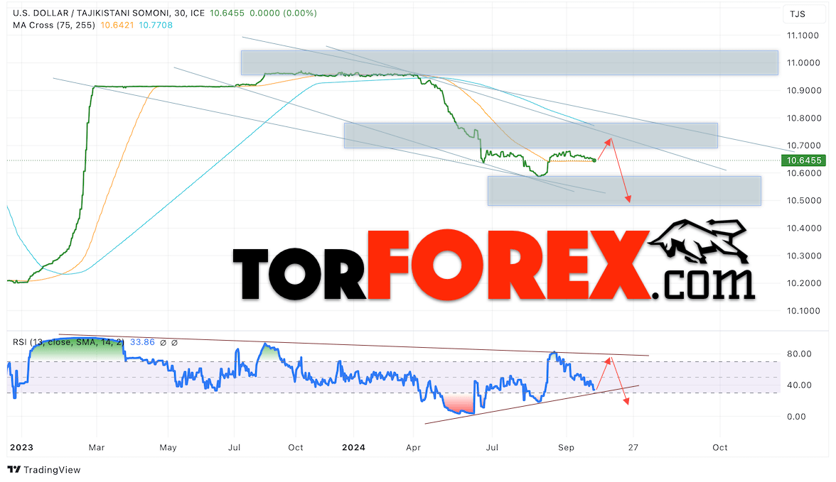 Дополнительным сигналом в пользу снижения валютной пары USD/TJS 27 сентября 2024 выступит тест медвежьей линии тренда на индикаторе относительной силы (RSI). Вторым сигналом станет пробой от нижней границы бычьего канала. Отменой варианта снижения пары USD/TJS станет сильный рост котировок и пробой уровня 10.80 Сомони за Доллар. Это укажет на пробой области сопротивления и продолжение роста пары Доллар Таджикский Сомони в область выше уровня 11.15. Подтверждением падению пары выступит пробой области поддержки и закрытие котировок актива над уровнем 10.60.