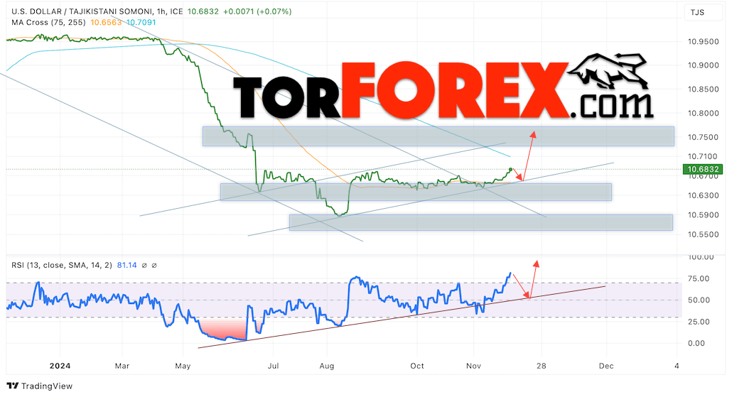 Валютная пара Доллар США Таджикский Сомони USDTJS продолжает движение в рамках сильного роста и восходящего канала. В момент публикации прогноза курс Доллара США к Таджикскому Сомони составляет 10.6832. Скользящие средние указывают на наличие краткосрочной медвежьей тенденции. Цены тестируют область между сигнальными линиями, что указывает на давление со стороны продавцов американской валюты и потенциальное продолжение падения Доллара США против Таджикского Сомони. В рамках прогноза курса Доллара на 28 ноября 2024 стоит ожидать попытку развития медвежьей коррекции цены и тест уровня поддержки вблизи области 10.6725 Сомони за Доллар США. Затем, отскок вверх и продолжение роста валютной пары в область выше уровня 10.7505.