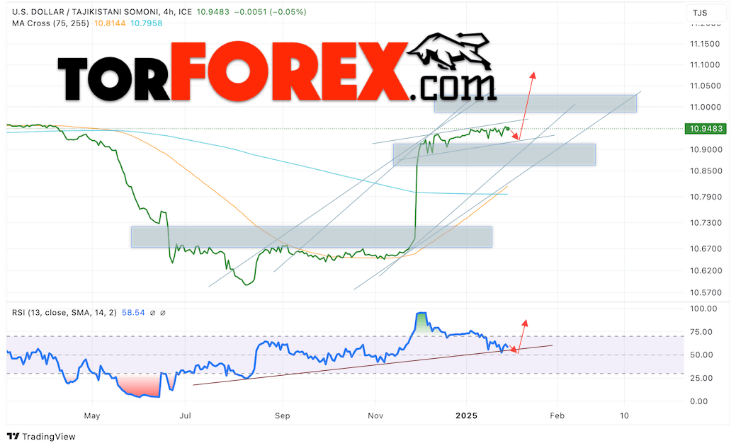 Валютная пара Доллар США Таджикский Сомони USDTJS продолжает движение в рамках роста и бычьего канала. В момент публикации прогноза курс Доллара США к Таджикскому Сомони составляет 10.9483. Скользящие средние указывают на наличие краткосрочной восходящей тенденции. Цены остаются над сигнальными линиями, что указывает на давление со стороны покупателей американской валюты и потенциальное продолжение подъёма курса Доллара США против Таджикского Сомони. В рамках прогноза курса Доллара на 29 января 2025 стоит ожидать попытку развития снижения и тест уровня поддержки вблизи области 10.9365 Сомони за Доллар США. Затем, отскок вверх и продолжение роста валютной пары в область выше уровня 11.0675.