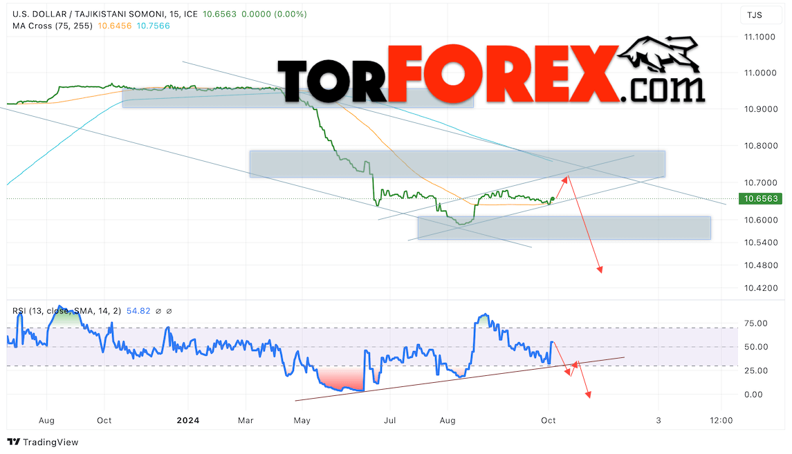 Таким образом, Сомони прогноз на сегодня 3 октября 2024 предполагает попытку теста уровня сопротивления вблизи области 10.7000. Откуда стоит ожидать отскок и продолжения падения курса Доллара США против Таджикского Сомони с целью ниже уровня 10.5000. Дополнительным сигналом в пользу снижения пары выступит тест линии тренда на индикаторе относительной силы. Отменой варианта падения станет пробой области сопротивления и закрытие котировок выше уровня 10.8000. В таком случае стоит ожидать продолжения подъёма курса доллара США против Сомони к уровню 11.0500.