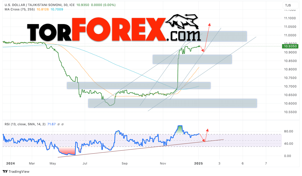 Дополнительным сигналом в пользу роста валютной пары USD/TJS 3 января 2025 выступит отбой от восходящей линии тренда на индикаторе относительной силы (RSI). Вторым сигналом станет отбой от нижней границы бычьего канала. Отменой варианта роста пары USD/TJS станет падение котировок и пробой уровня 10.8405 Сомони за Доллар. Это укажет на пробой области поддержки и продолжение падения пары Доллар Таджикский Сомони в область ниже уровня 10.7865. Подтверждением росту пары выступит пробой области сопротивления и закрытие котировок актива над уровнем 10.9655.