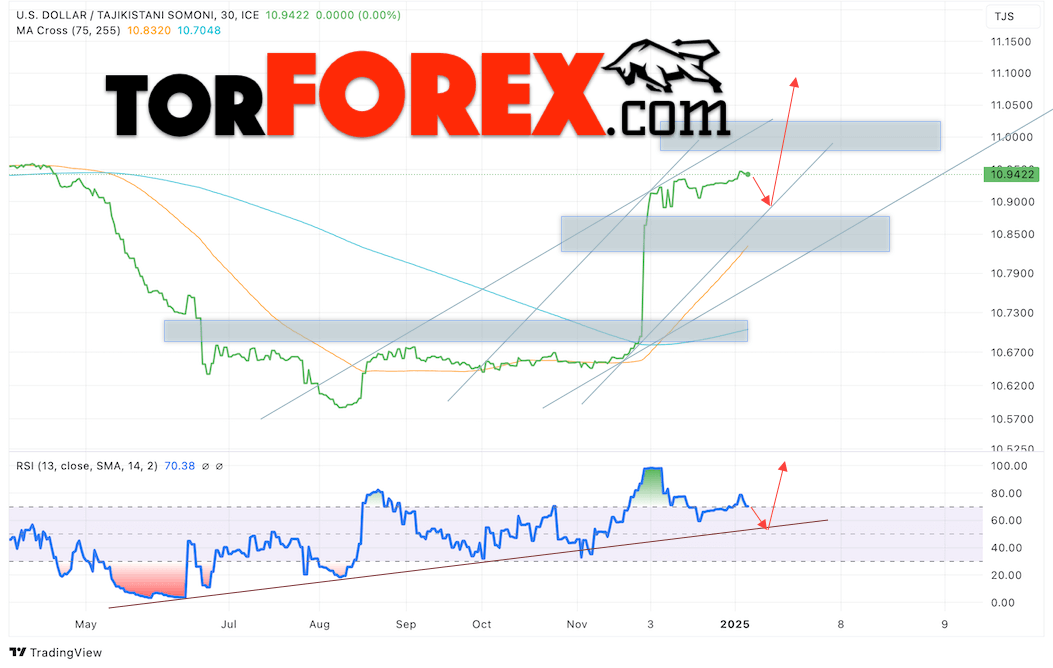 Дополнительным сигналом в пользу роста валютной пары USD/TJS 8 января 2025 выступит отбой от восходящей линии тренда на индикаторе относительной силы (RSI). Вторым сигналом станет отбой от нижней границы бычьего канала. Отменой варианта роста пары USD/TJS станет падение котировок и пробой уровня 10.8545 Сомони за Доллар. Это укажет на пробой области поддержки и продолжение падения пары Доллар Таджикский Сомони в область ниже уровня 10.7765. Подтверждением росту пары выступит пробой области сопротивления и закрытие котировок актива над уровнем 10.9665.