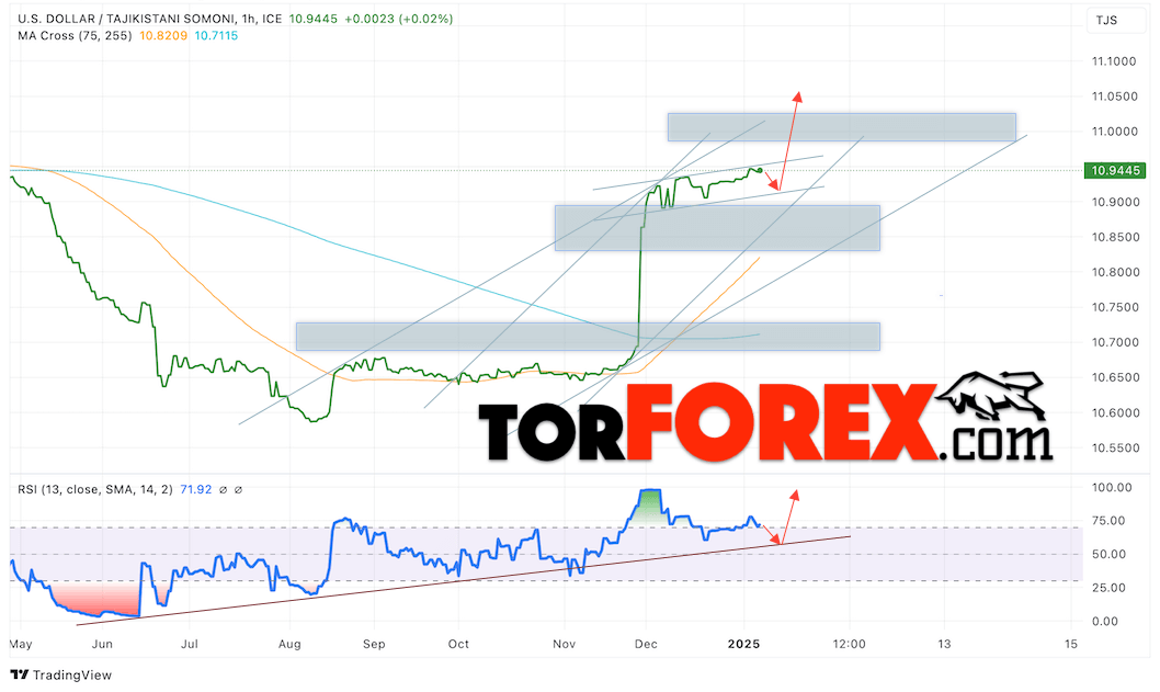 Валютная пара Доллар США Таджикский Сомони USDTJS продолжает движение в рамках роста и бычьего канала. В момент публикации прогноза курс Доллара США к Таджикскому Сомони составляет 10.9445. Скользящие средние указывают на наличие краткосрочной бычьей тенденции. Цены пробили область между сигнальными линиями вверх, что указывает на давление со стороны покупателей американской валюты и потенциальное продолжение подъёма курса Доллара США против Таджикского Сомони. В рамках прогноза курса Доллара на 9 января 2025 стоит ожидать попытку развития падения и тест уровня поддержки вблизи области 10.9045 Сомони за Доллар США. Затем, отскок вверх и продолжение роста валютной пары в область выше уровня 11.0505.
