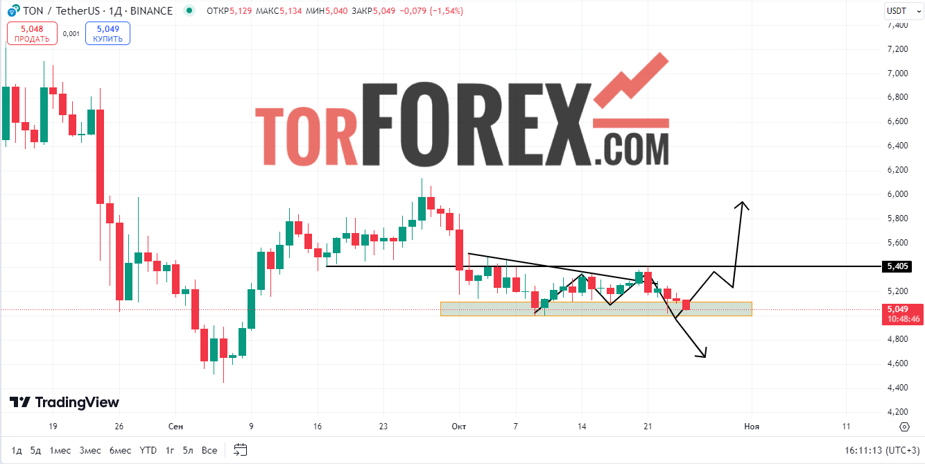 На дневном графике TON остаётся под давлением, а индикатор RSI находится в зоне около 43, что указывает на нейтральное состояние. Однако MACD близок к переходу в зону выше сигнальной линии, что говорит о возможном развороте, если удастся преодолеть ближайшие уровни сопротивления на отметке в $5,4.