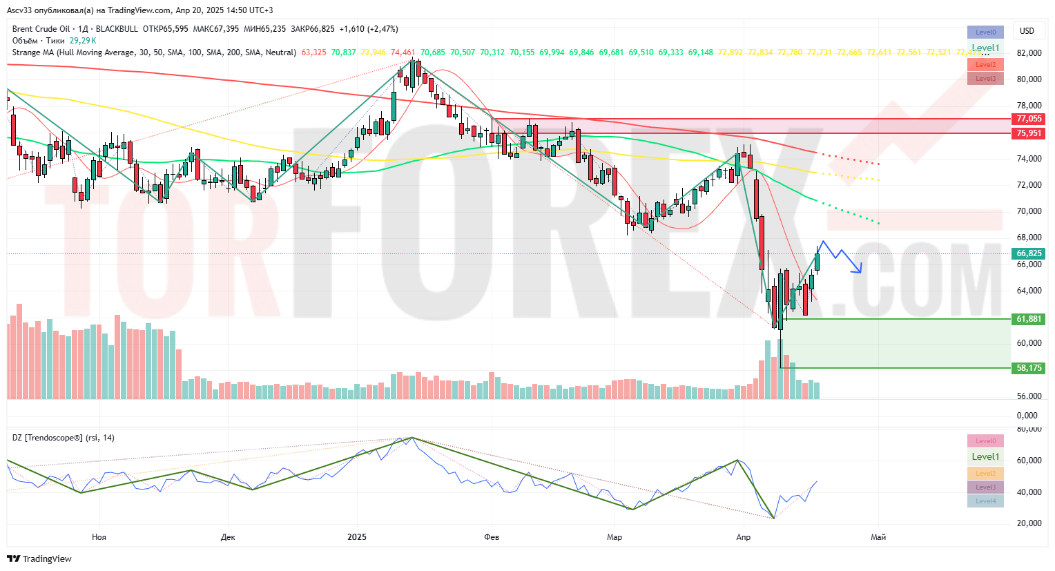 - При сохранении давления в районе 67–68 долларов Brent может развернуться вниз и направиться к поддержке 64–63 долларов.