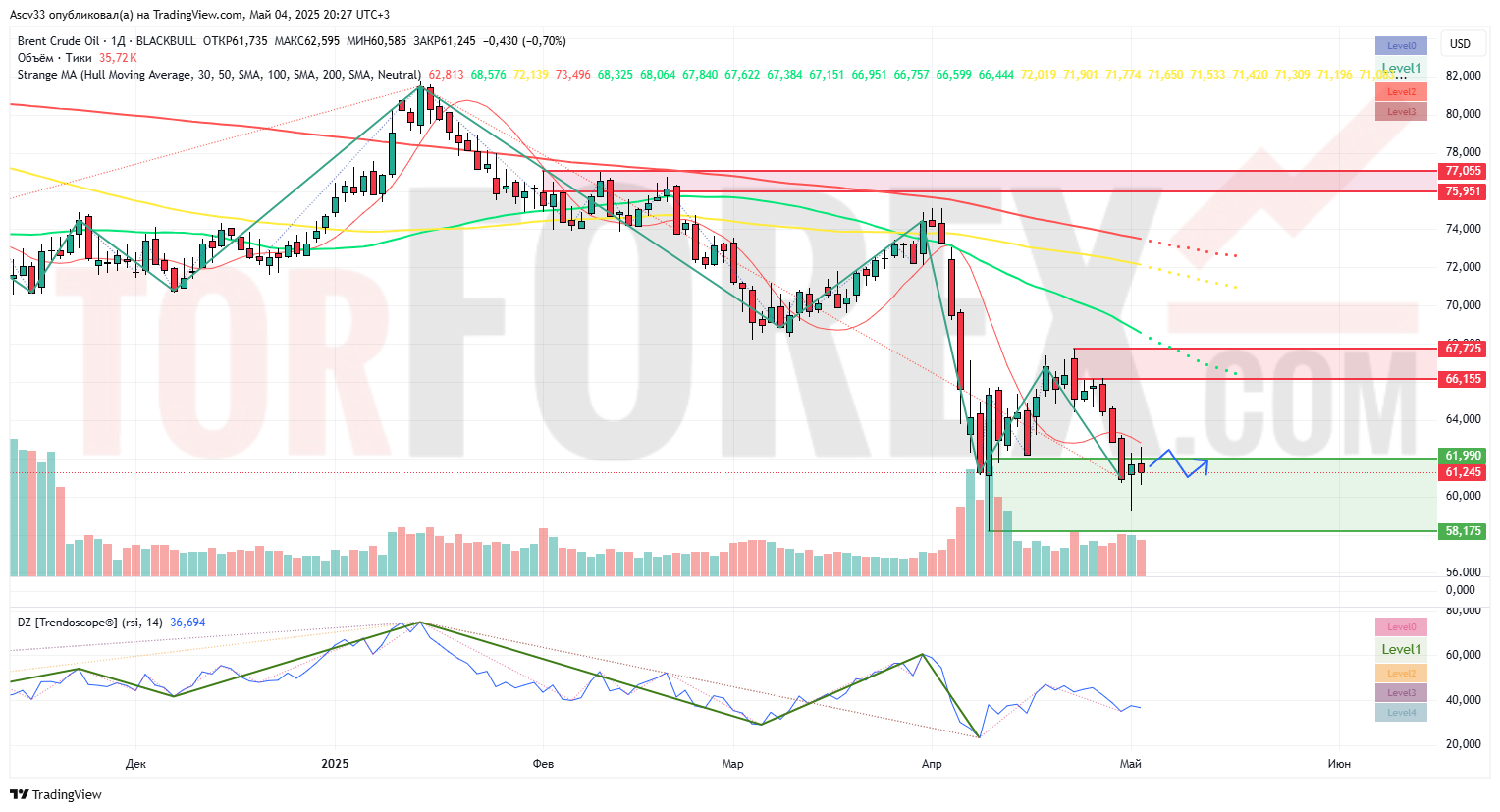 Цены на нефть марки Brent завершили первую неделю мая вблизи отметки $61,25, демонстрируя слабость быков и рост давления со стороны продавцов. Геополитические и макроэкономические факторы продолжают оказывать влияние, но с технической точки зрения рынок уже вошёл в фазу понижательного импульса. Внимание инвесторов сосредоточено на уровнях поддержки, которые могут сдержать текущее снижение.
