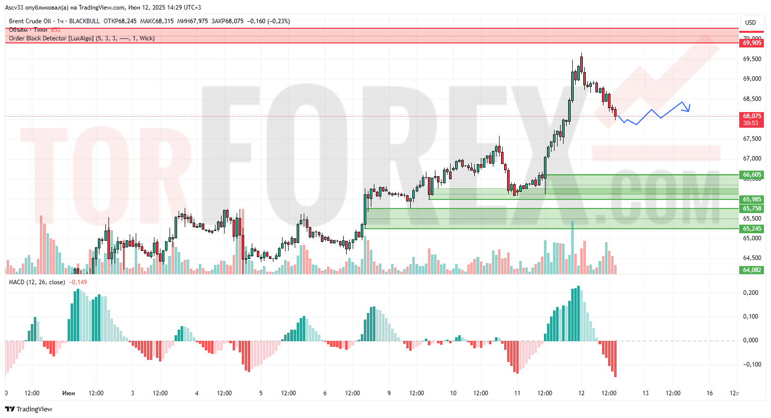 После стремительного роста Brent достигла локального пика у 69,9 и начала коррекцию. Текущее снижение выглядит как техническая реакция на зону предложения. Общая тенденция остаётся восходящей, но в краткосрочной перспективе рынок тестирует поддержку.