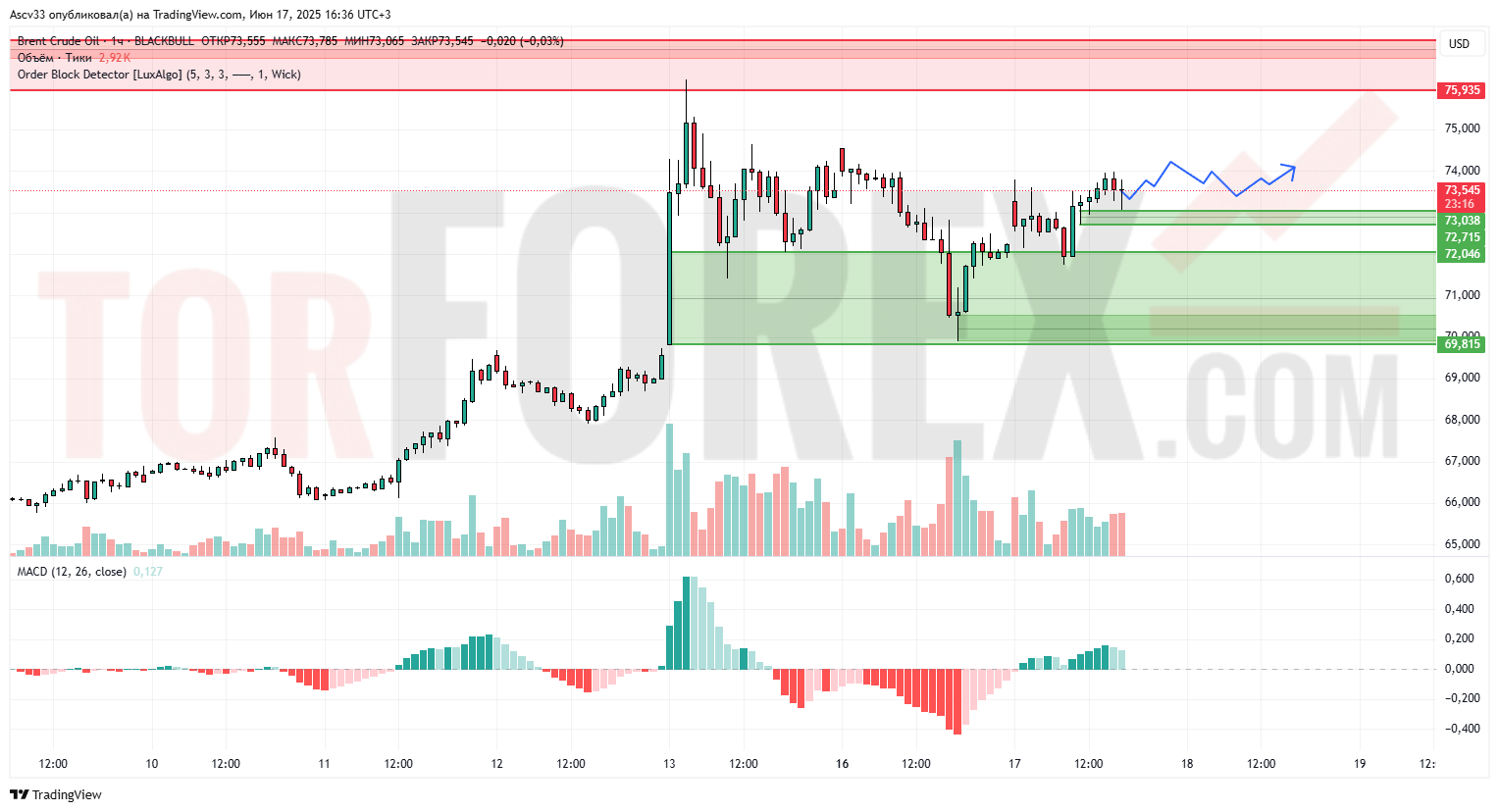 Цена на нефть Brent удерживается в диапазоне выше зоны поддержки 72,04–73,04, что говорит о стабильности покупателей. После импульсного роста 13 июня рынок вошёл в фазу консолидации с поддержкой в районе 73,00 и сопротивлением вблизи 74,00. Формируется локальный «флаг» на фоне уменьшения волатильности, что может стать базой для нового импульса.