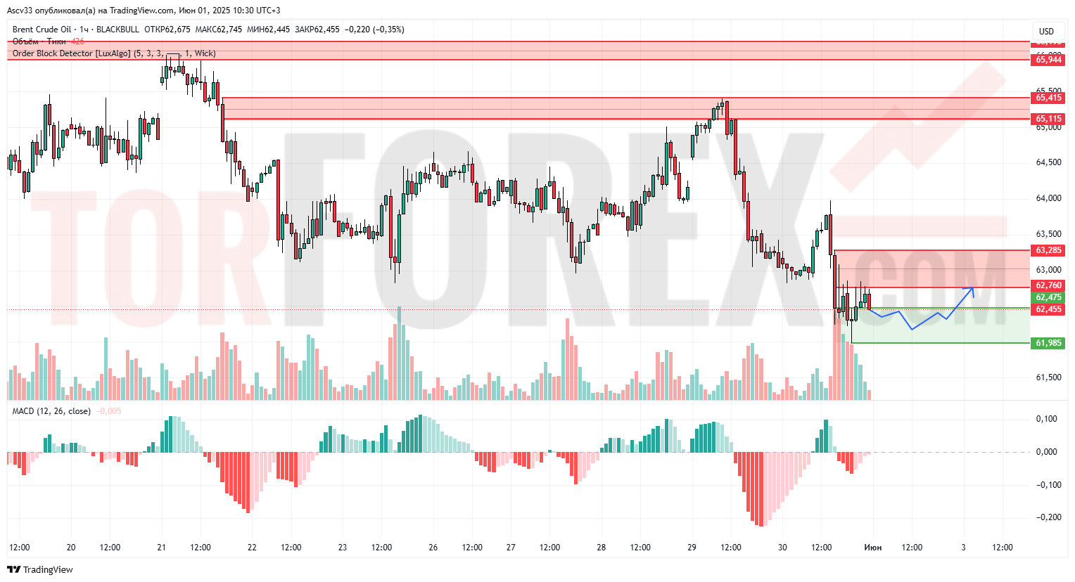 После снижения от уровня 65,00 цена Brent стабилизировалась в узком диапазоне над поддержкой 62,45. Формируется попытка консолидации у нижней границы зоны спроса. MACD близок к нулю с признаками возможного разворота, но объёмы остаются на низких уровнях — это сигнал ограниченной активности и неопределённости рынка.
