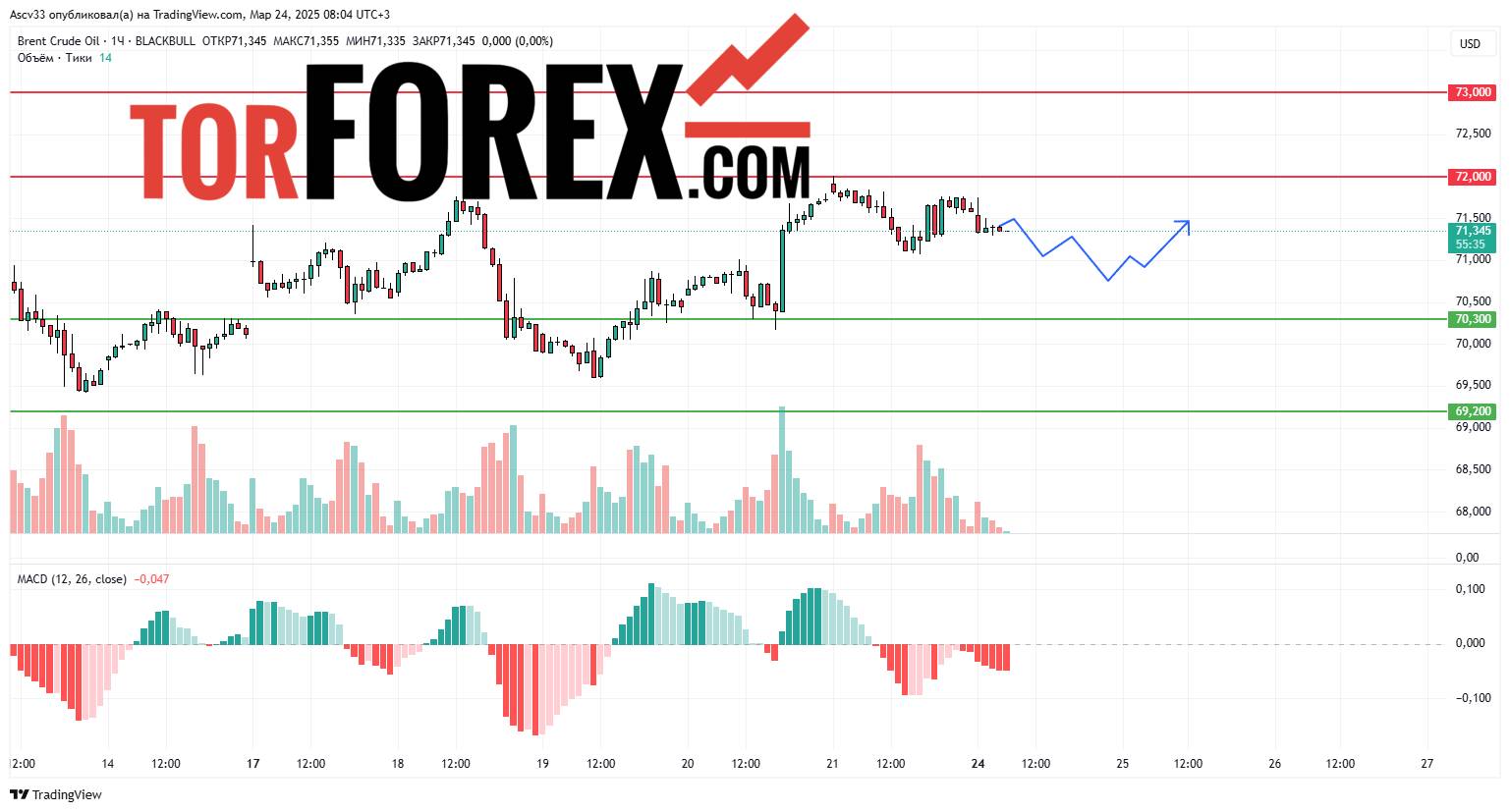 Ожидается, что цена нефти Brent останется в диапазоне 70,30–72,00 USD в течение 24 марта. Пробой 72,00 USD вверх подтвердит восходящее движение, тогда как закрытие ниже 70,30 USD может усилить медвежьи настроения. Трейдерам рекомендуется внимательно следить за изменениями курса вблизи этих ключевых уровней, так как их прорыв может значительно повлиять на дальнейшие стратегии на рынке нефти.